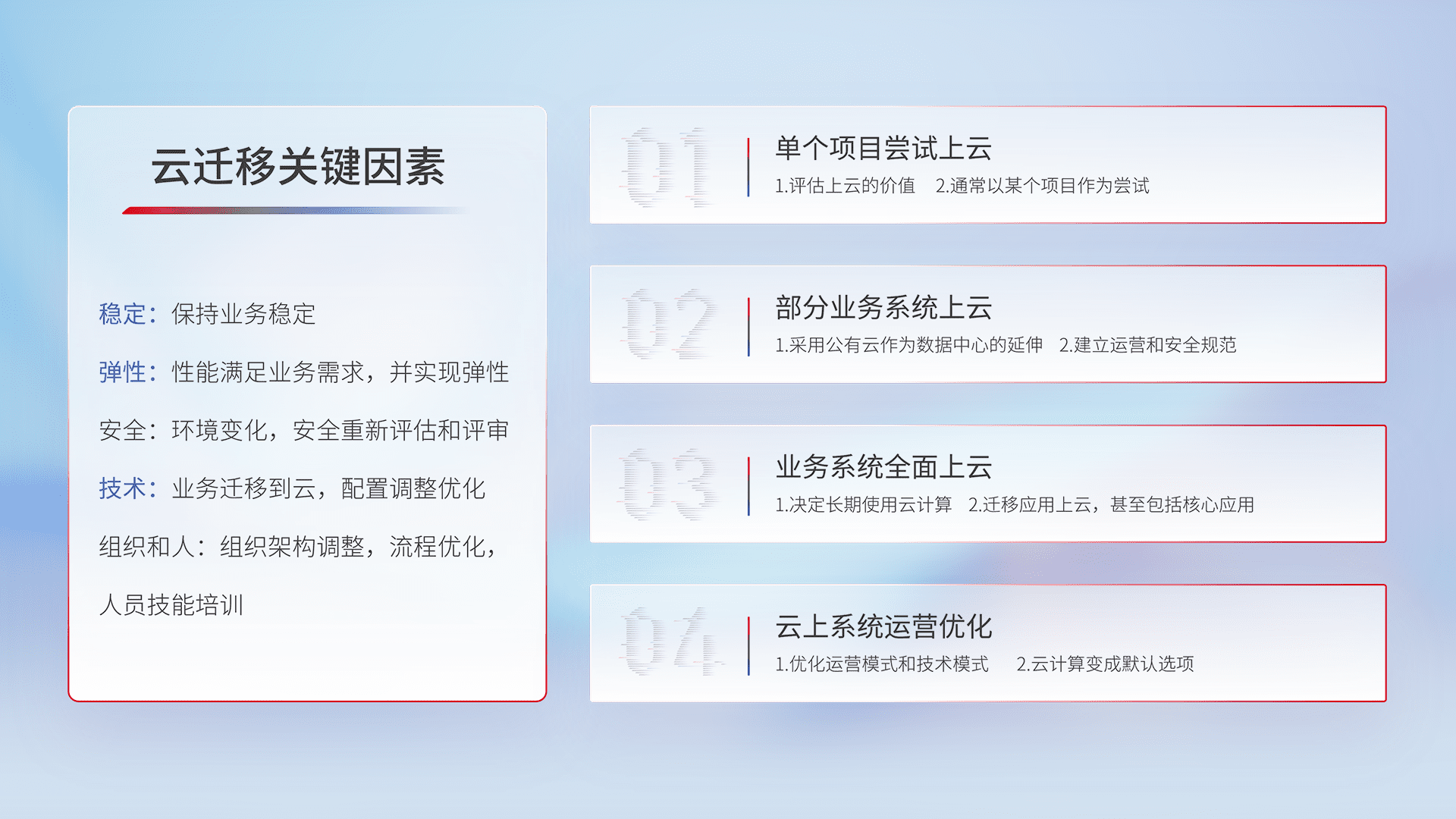 结合实际业务,,,从规划设计、、、、云平台选型、、、云原生改造、、数据迁移、、、集成交付,,,,迁移全过程为客户识别最佳上云路径,,,,做好风险识别管理,,,设计网络架构、、、身份权限、、、安全审计合规、、操作审计、、、日志审计、、、监控告警策略、、、、多站点容灾设计等,,,对云上基础设施进行整体规划,,,,提升IT治理水平,,以满足弹性、、、、高可用、、、、高性能的需求。。。。