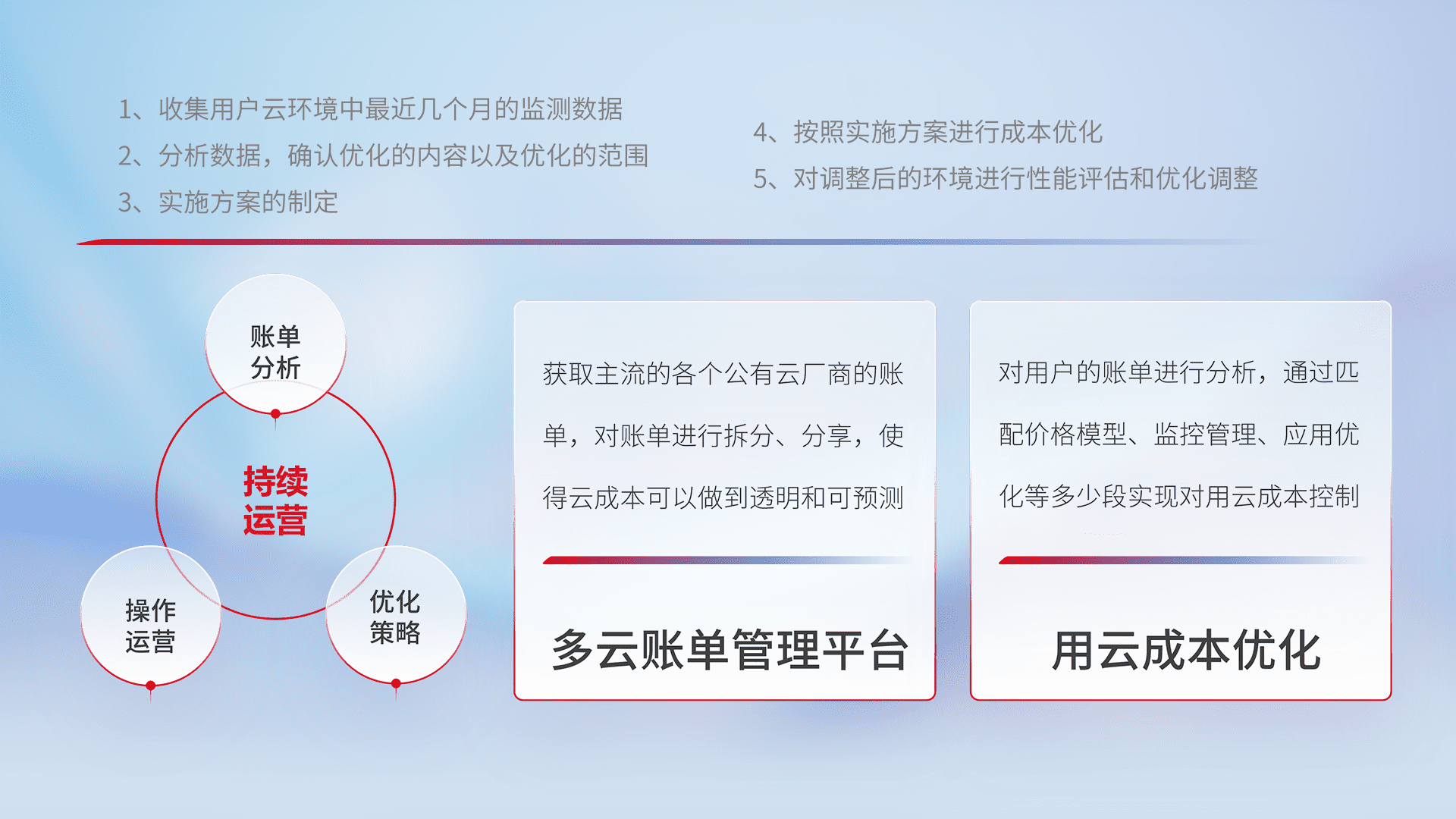 通过多云纳管,,,,以统一的资源数据模型把客户的云资源进行抽象和封装,,进而实现对多云资源的统一操作,,保障云资源管理的可靠性、、、稳定性与可用性。。。。量身定制化运维内容,,,配置、、、、开发运维、、、、补丁管理、、、备份、、监控、、、、认证和访问管理、、审计和日常巡检等,,保障在用云过程中的可靠度,,,,稳定度以及高可用率。。。。