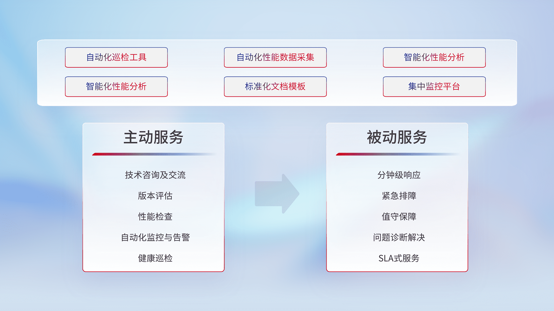 智能化工具和标准化文档,,,保障服务质量,,,提供主动服务(包含技术咨询、、、版本评估、、性能检查、、、自动化监控与告警、、、健康巡检)和被动服务包含(分钟级响应、、、紧急排障、、、、值守保障、、问题诊断解决、、SLA服务)。。