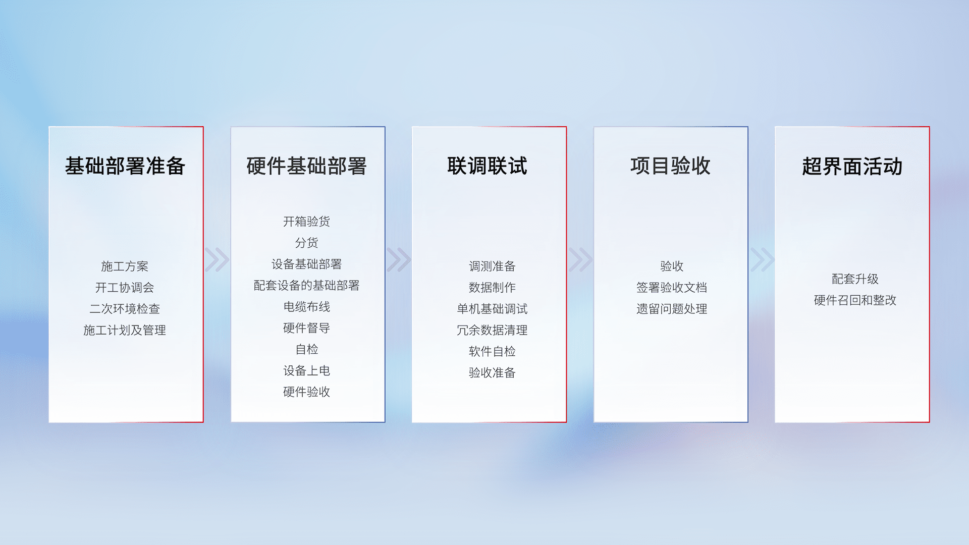 从基础部署准备、、、、硬件基础部署、、、联调联试、、、项目验收、、、越界面活动的全过程可追溯,,保证施工质量和进度。。。